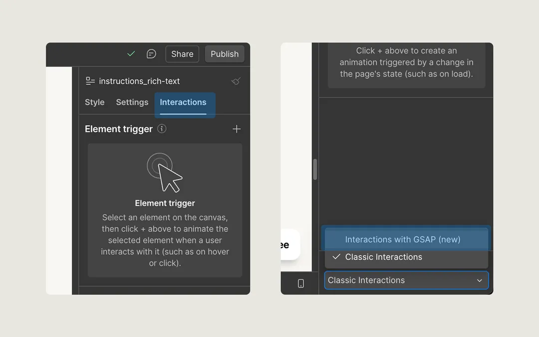 If you don’t see the interactions icon (⚡️) on the left panel, it’s likely because you still have Classic Interactions enabled instead of the newer GSAP-based Interactions (IX3). To fix this, open the Interactions tab and scroll to the bottom — there, you’ll find a toggle switch that lets you activate the new Interactions panel. Once enabled, you’ll have access to all the animations used in this template.